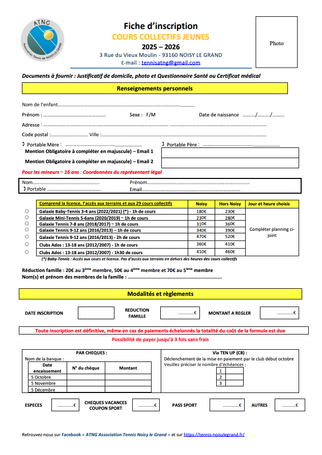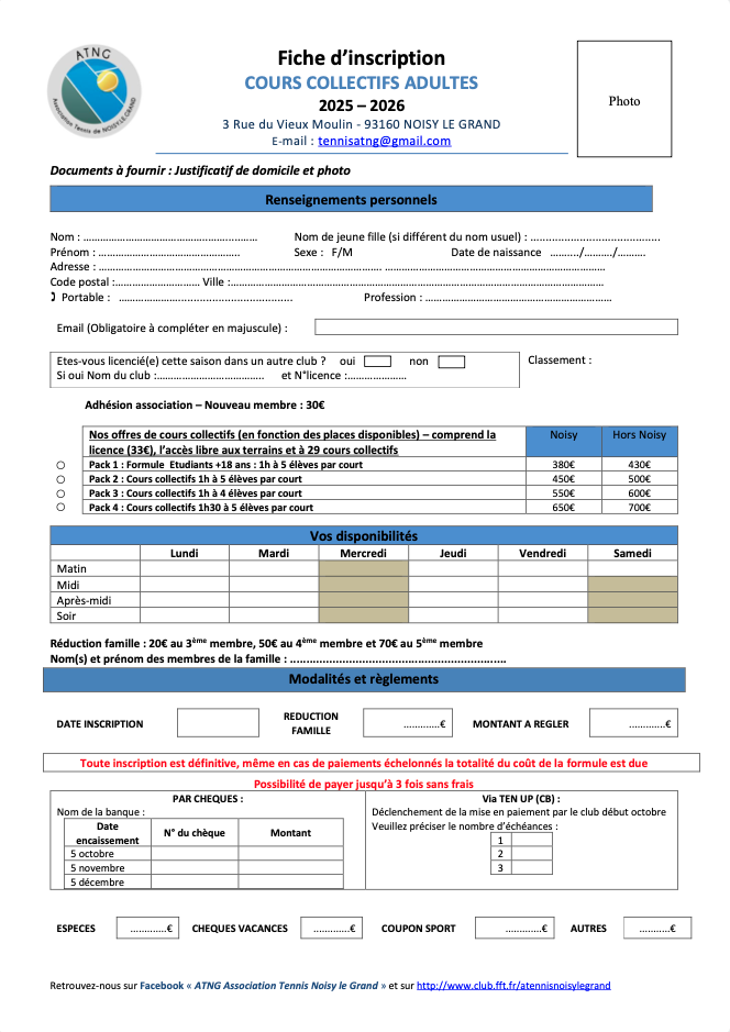 COURS COLLECTIFS: (comprend la licence et l’accès aux terrains)