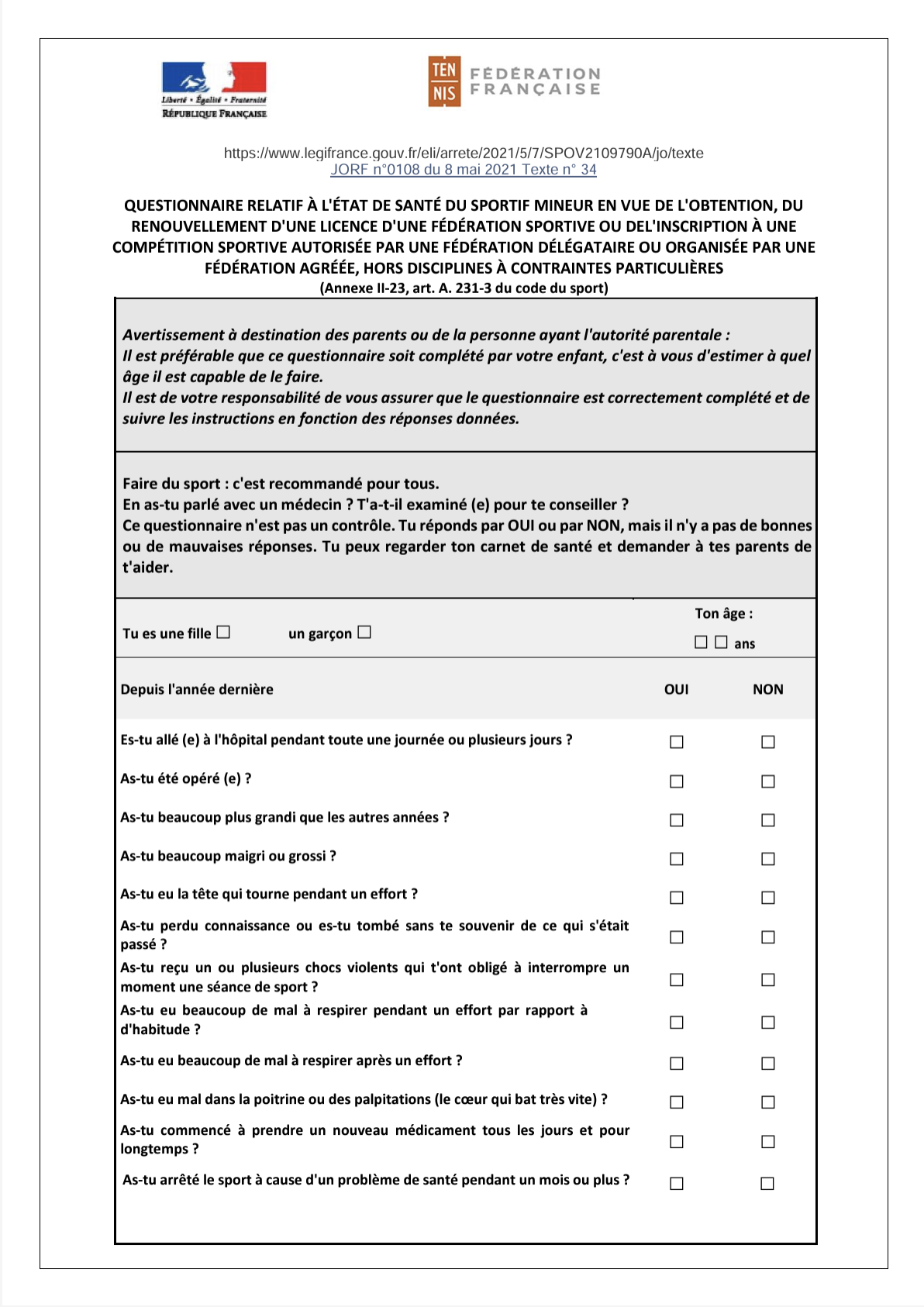 MINEURS: Questionnaire santé permettant l'obtention de la licence